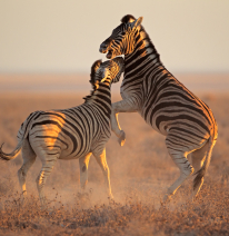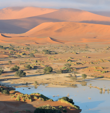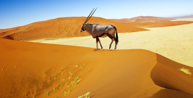 En este mágico rincón de África, contemplarás los impresionantes colores rojizos de las dunas, descubrirás un valle poblado con increíbles -árboles momificados- y conocerás a sus elegantes habitantes: los oryx (una especie parecida a las gacelas) y sus siempre acompañantes hienas y chacales. Además en el recinto del parque natural podrás observar cebras, bandadas de simpáticos flamencos, avestruces y jirafas, entre otras especies de animales -incluso algunos de los Cinco Pequeños de África-, revoloteando por las finas arenas del desierto Namibia.